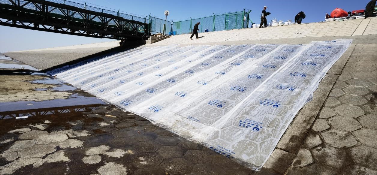 混凝土節(jié)水保濕養(yǎng)護膜,是以新型可控高分子吸水材料為核心,以塑料薄膜為載體,通過設(shè)備加工復(fù)合而成的卷材產(chǎn)品。其中高分子材料可吸收自重200倍的水分子, 吸水膨脹后變成透明的晶狀體,把液態(tài)水變成固態(tài)水,每平方米養(yǎng)護膜可蓄水0.5KG,成為一個固態(tài)的微型水庫,然后通過毛細(xì)管的作用向混凝土養(yǎng)護面滲透, 同時不斷吸收混凝土在水化過程中產(chǎn)生的蒸發(fā)水,因此在一個養(yǎng)護期內(nèi)總能保持混凝土表面濕潤。
